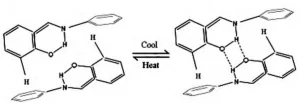 The color-changing of this kind of reversible thermochromic materials can attribute to the tautomeric interconversion of the ketone form and enol form. This kind of material is mainly synthesized by phenanthrene aldehyde, naphthaldehyde, ortho-hydroxy derivatives of benzaldehyde, and their respective analogs. The tautomeric interconversion of Salicylidene aniline are respectively ketonic forms and enolic forms. There is a balance of temperature sensitivity between the two forms, as shown in Figure below. Salicylidene aniline is a kind of a compound with a Schiff base nature and a catecholic backbone. When the temperature rises, the enolic structure enriches; conversely, when the temperature drops, the ketonic structure decreases. The change of temperature leads to the change of color.